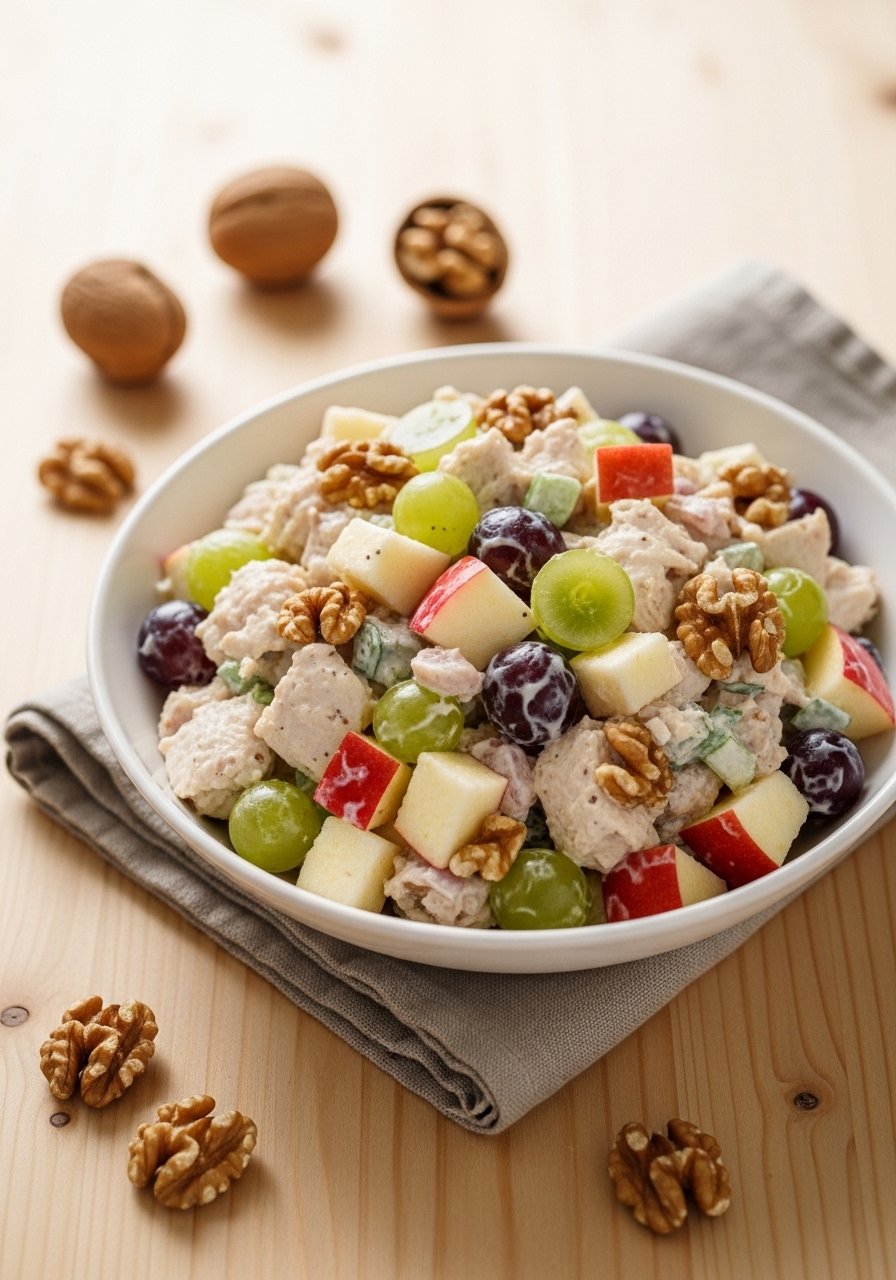 - Add fruit and chicken: Fold in apple, grapes, walnuts, and chicken.
