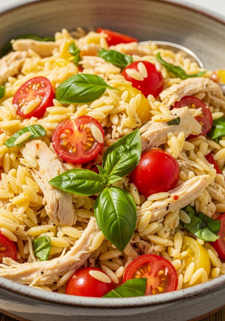 - Combine: Toss orzo, chicken, tomatoes, and basil with dressing.