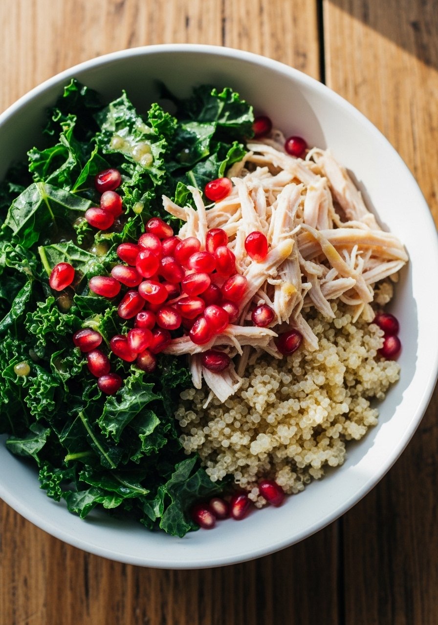 - Combine: Mix quinoa, chicken, kale, and pomegranate seeds; toss with dressing.