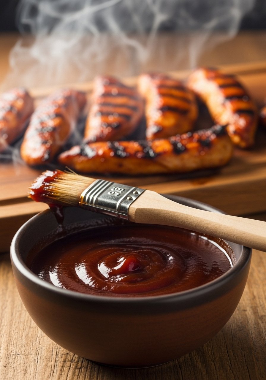 This tangy BBQ is a balanced backyard-style sauce—tomato backbone, molasses sweetness, and a bright vinegar tang. Ideal for dipping or slathering onto freshly fried strips.