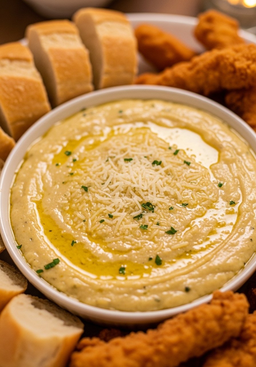 This ranch leans cheesy with grated Parmesan and roasted garlic for depth. It’s tangy, herby, and thick enough to cling to strips. Great for dipping at parties or dolloping over wedge salads.