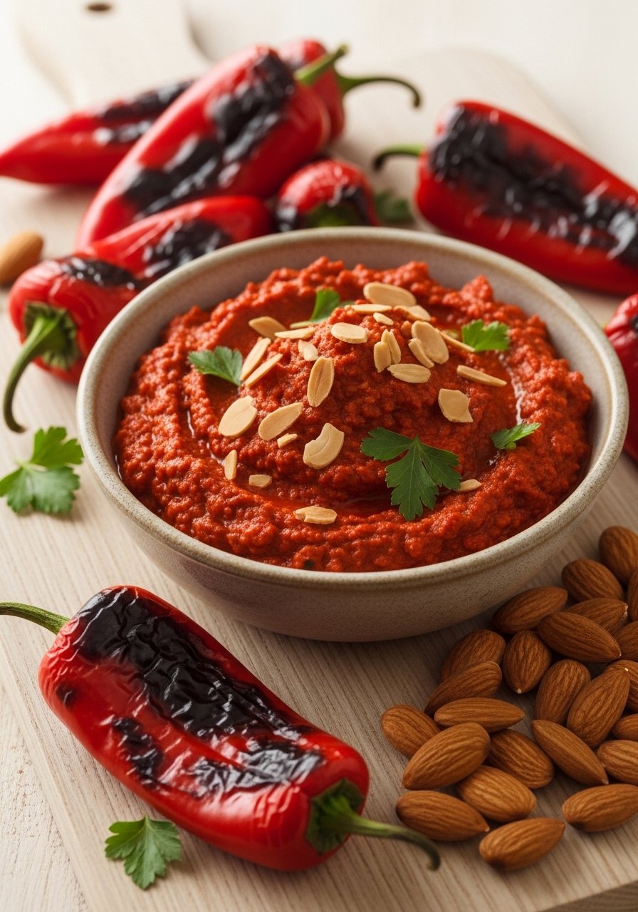 Smoky roasted red peppers and toasted almonds create a nutty, vibrant dip with savory depth. It’s rustic and flavorful.