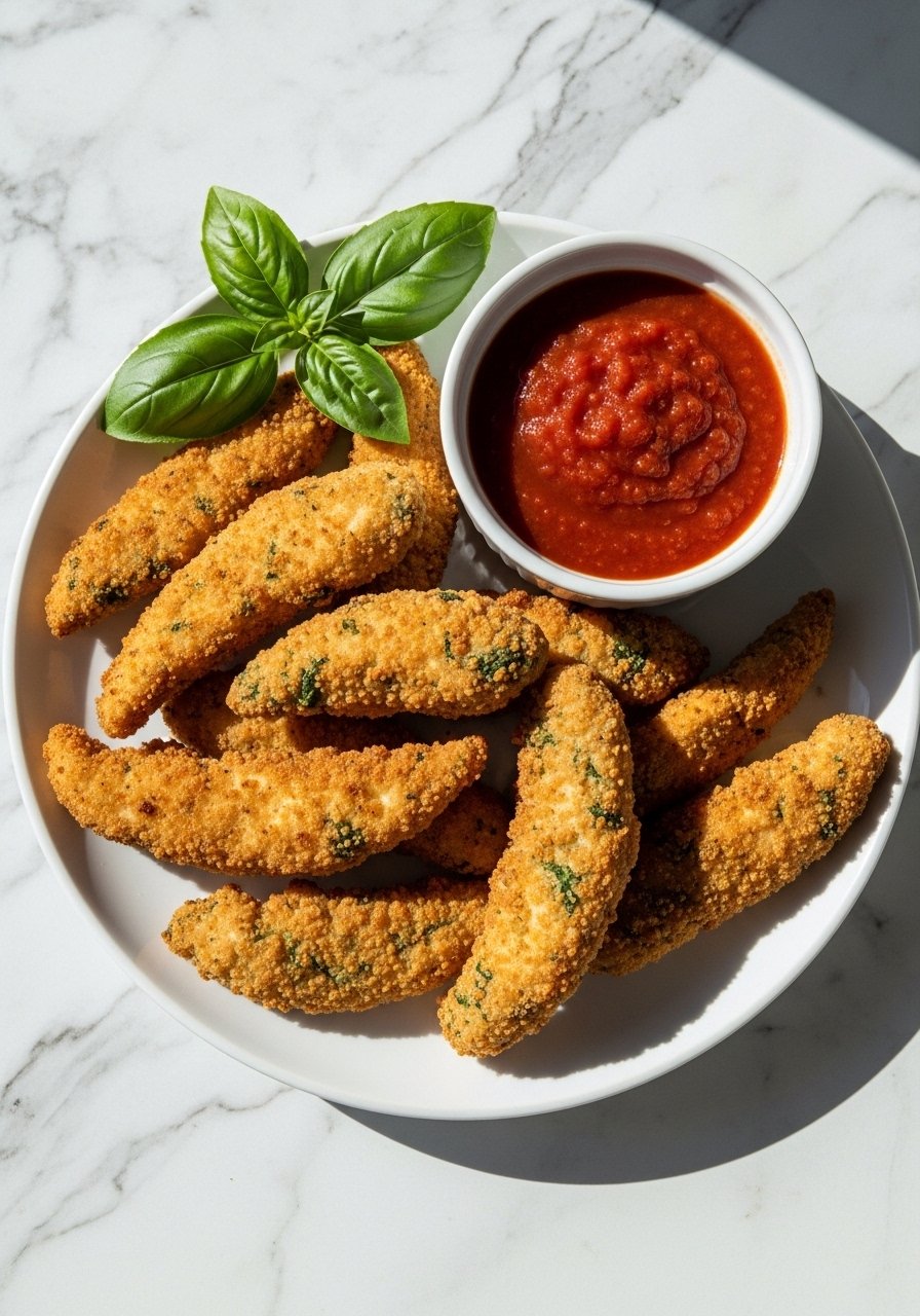 Serve with small ramekins of ketchup, honey mustard, or ranch. Garnish with chopped parsley for color. Pack leftovers into glass meal prep containers—they stay crisp when reheated in the oven or air fryer. Make ahead: bread strips and freeze on a tray, then transfer to freezer bags for easy dinners.