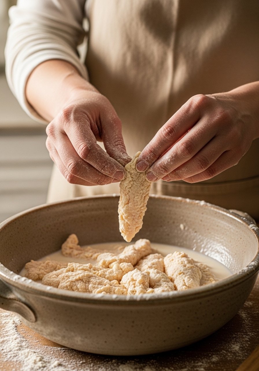 - Mix flour, salt, and pepper. Dip marinated strips in flour, egg, then panko.