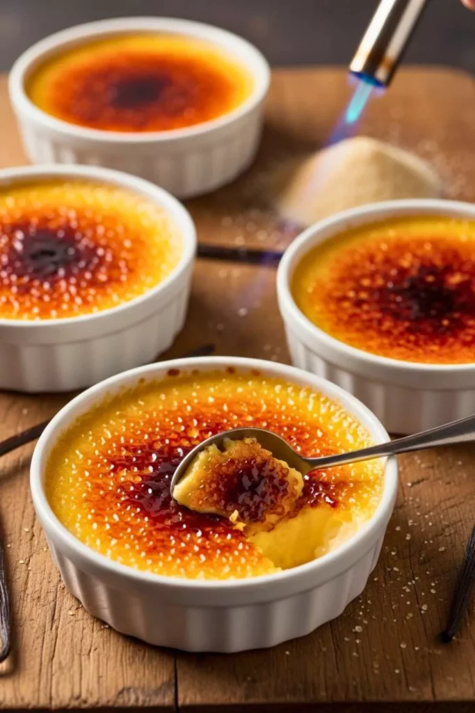 Just before serving, sprinkle about 1 teaspoon of granulated sugar evenly on top of each custard. Use a kitchen torch to melt and caramelize the sugar until it turns golden brown and crisp. If you don’t have a torch, place the ramekins under a hot broiler for a minute or two, watching closely to prevent burning.