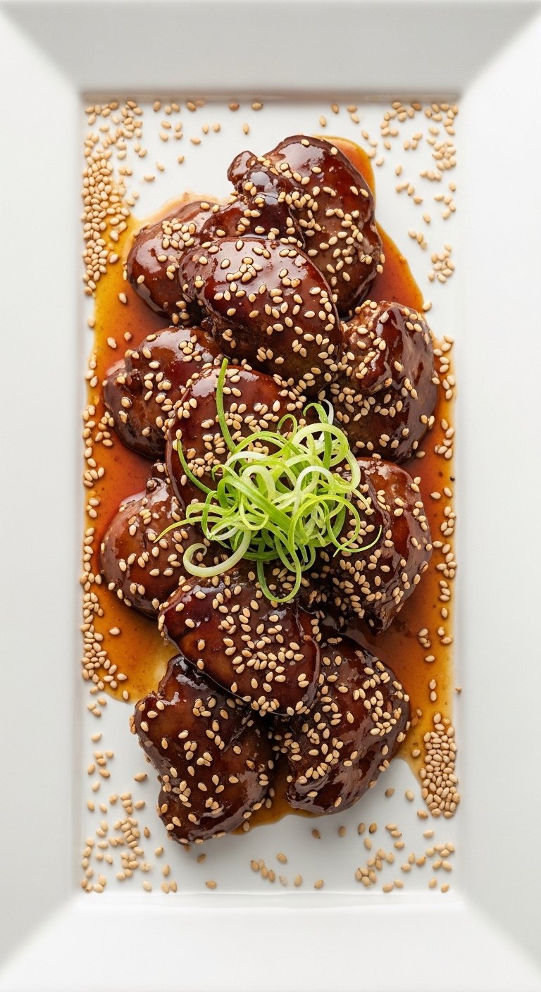 - Toss: Briefly toss fried livers in glaze to coat, then plate. Garnish with sesame seeds and scallions.