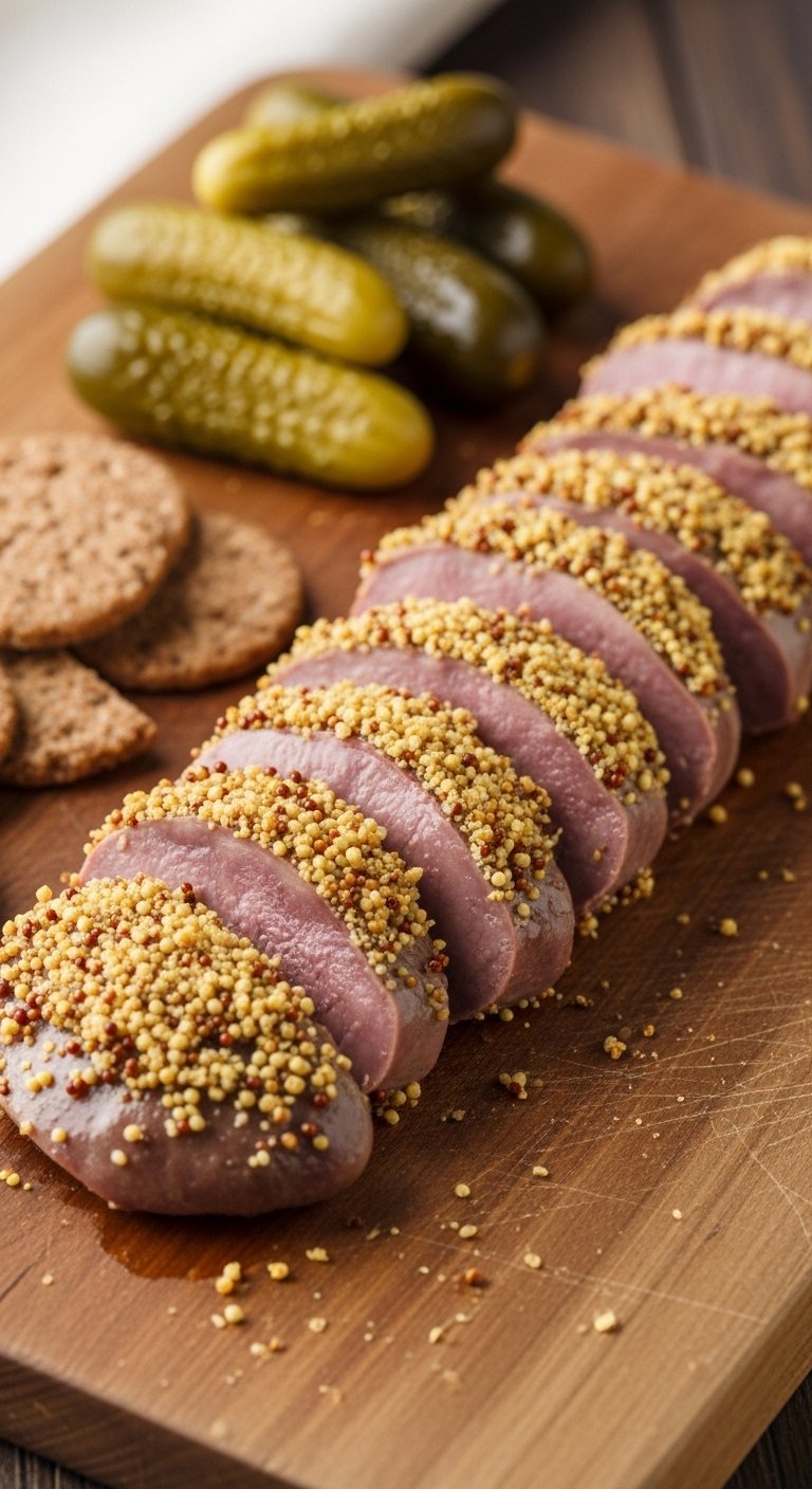 Whole-grain mustard forms a flavorful crust that crisps when seared. The tang cuts through the richness and gives a rustic, savory bite.