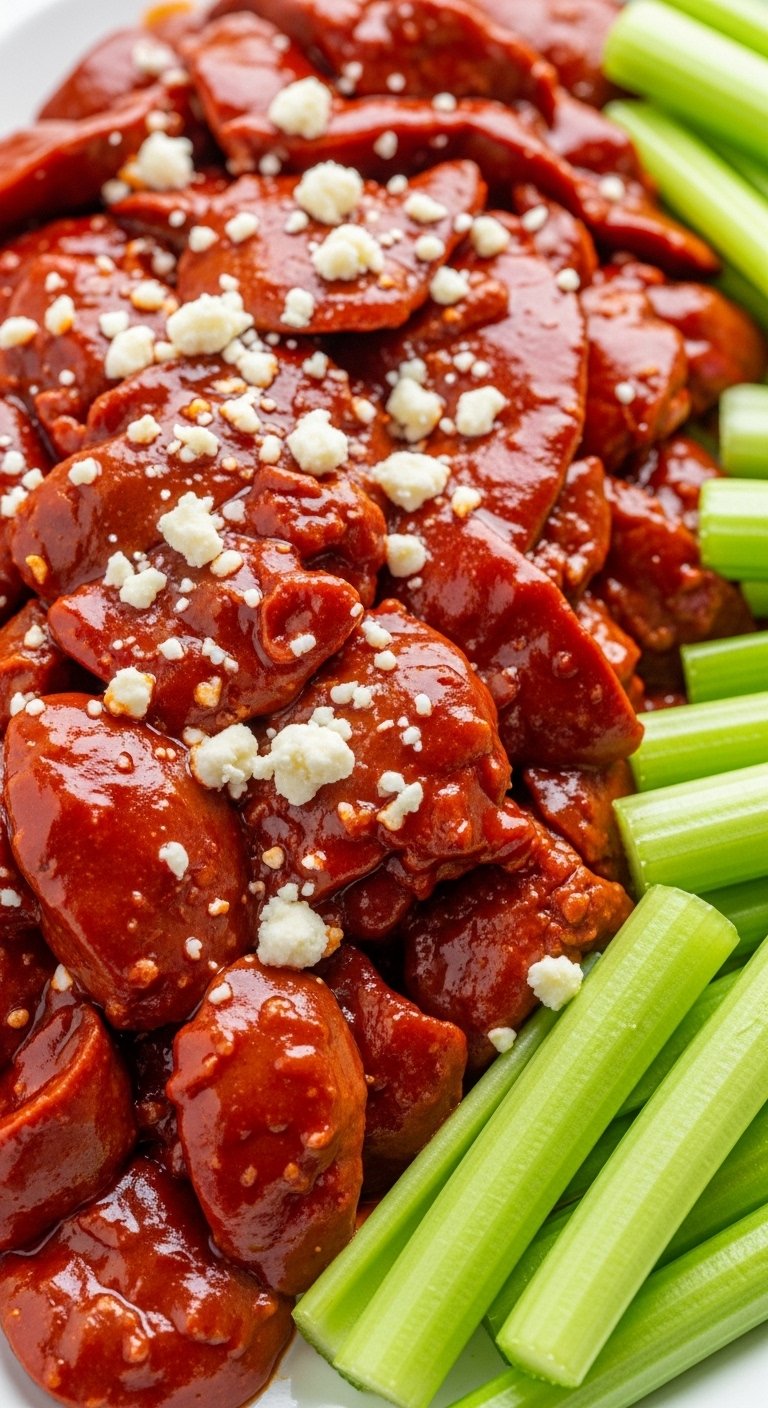Buffalo sauce adds tangy heat to crispy livers, transforming them into bold, game-day snacks. Blue cheese dip cools the spice perfectly.