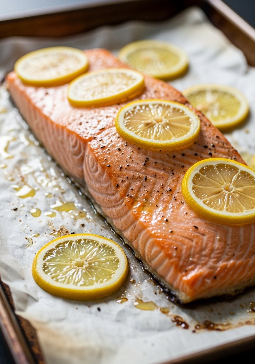 - Season Salmon — Place salmon on sheet, drizzle with olive oil, season with salt and pepper, top with lemon slices.