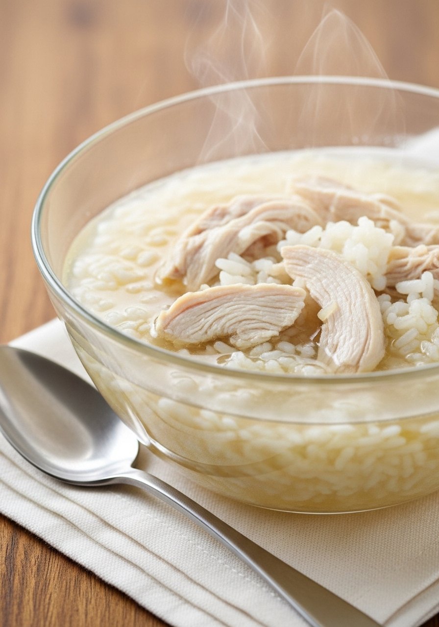 A plain, nourishing soup featuring tender chicken and soft rice. Gentle on digestion and easy to sip when you need mild, comforting flavors.
