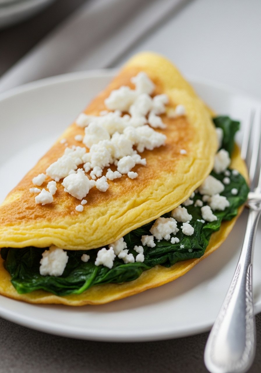 - Cook Omelette — Pour eggs into skillet over medium-low, cook until edges set, add spinach and feta on one half.