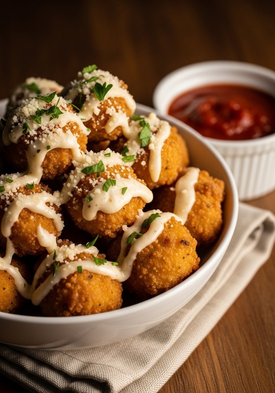 These bite-sized pieces turn crisp on the outside and stay juicy inside. The garlic-parm coating clings to every nook, so each bite tastes buttery, savory, and a little salty—perfect with pasta, salad, or a simple dip.