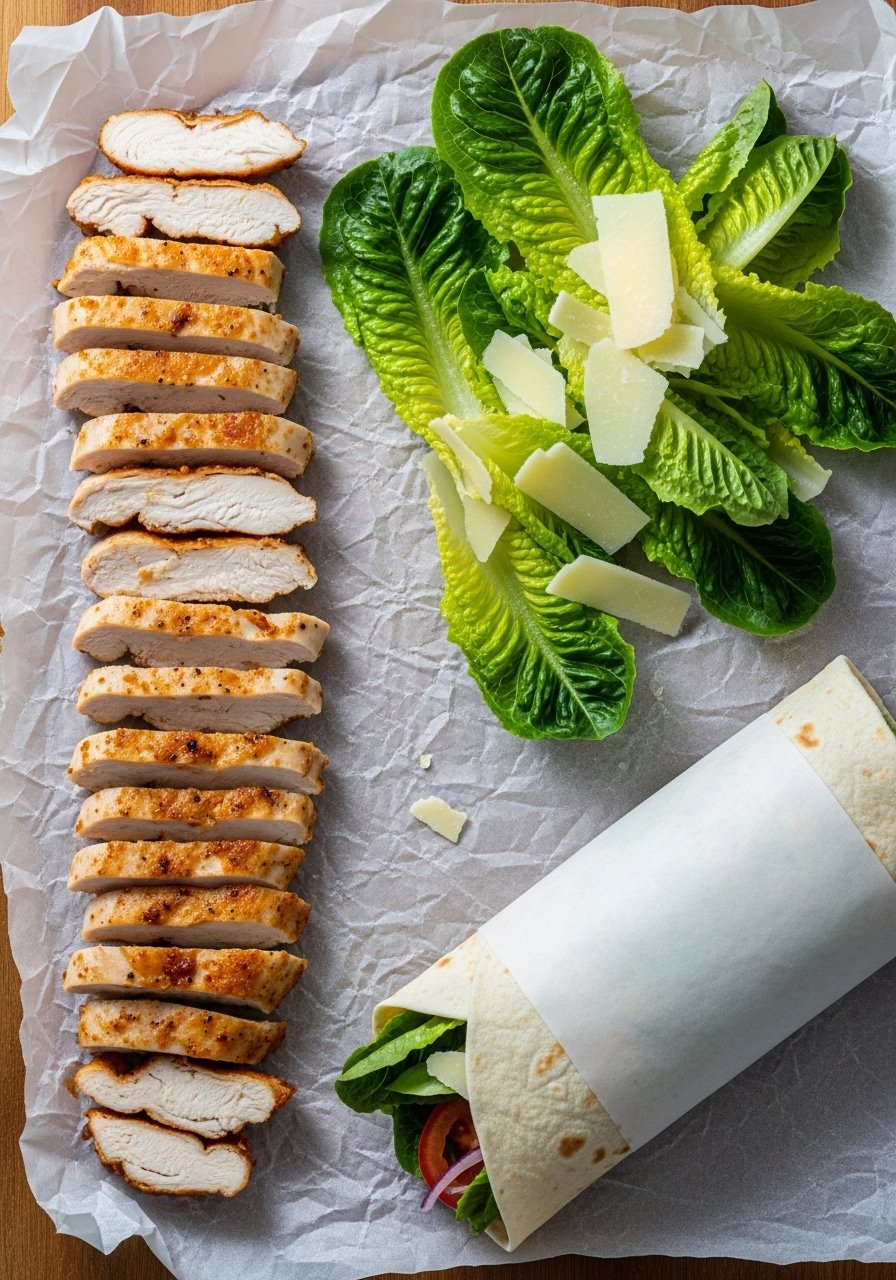 - Assemble: Toss with romaine, parmesan, and Caesar dressing; wrap and serve.