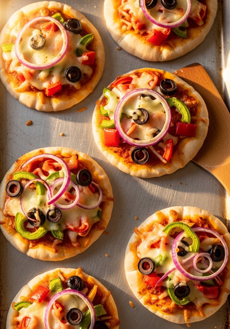 - Assemble: Brush pitas with oil, spread sauce, sprinkle veggies, and top with mozzarella.