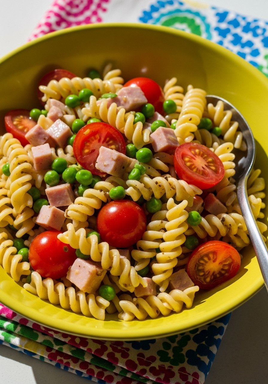 - Combine: In a bowl, toss pasta, ham, peas, and tomatoes with dressing.