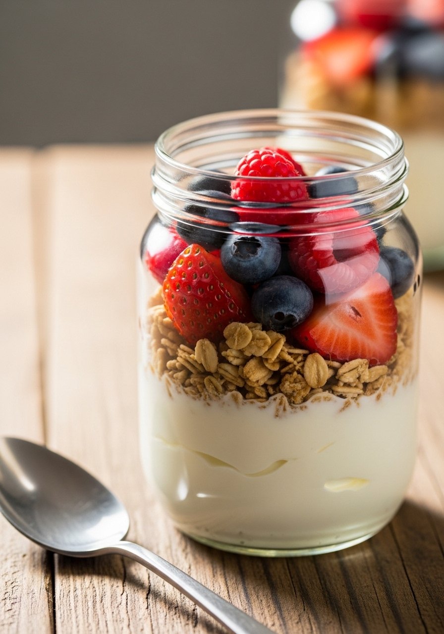 - Layer: Spoon yogurt into a jar, add a layer of berries, then more yogurt.