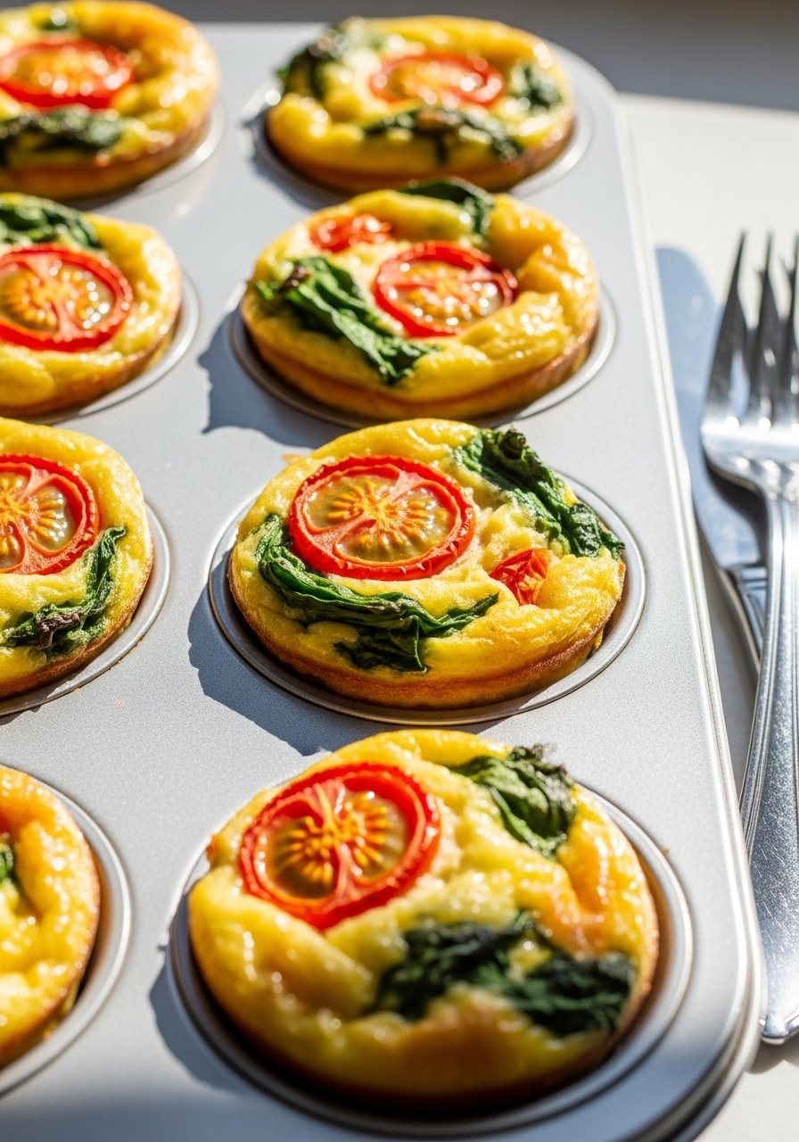 - Fill: Pour into greased muffin tin halves and add cheese and spinach.