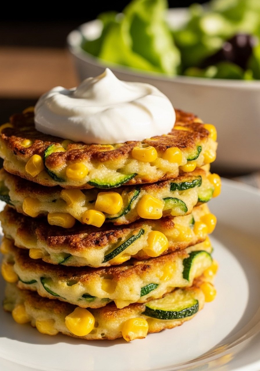 - Mix: Combine zucchini, corn, flour, egg, salt, and pepper to make a batter.