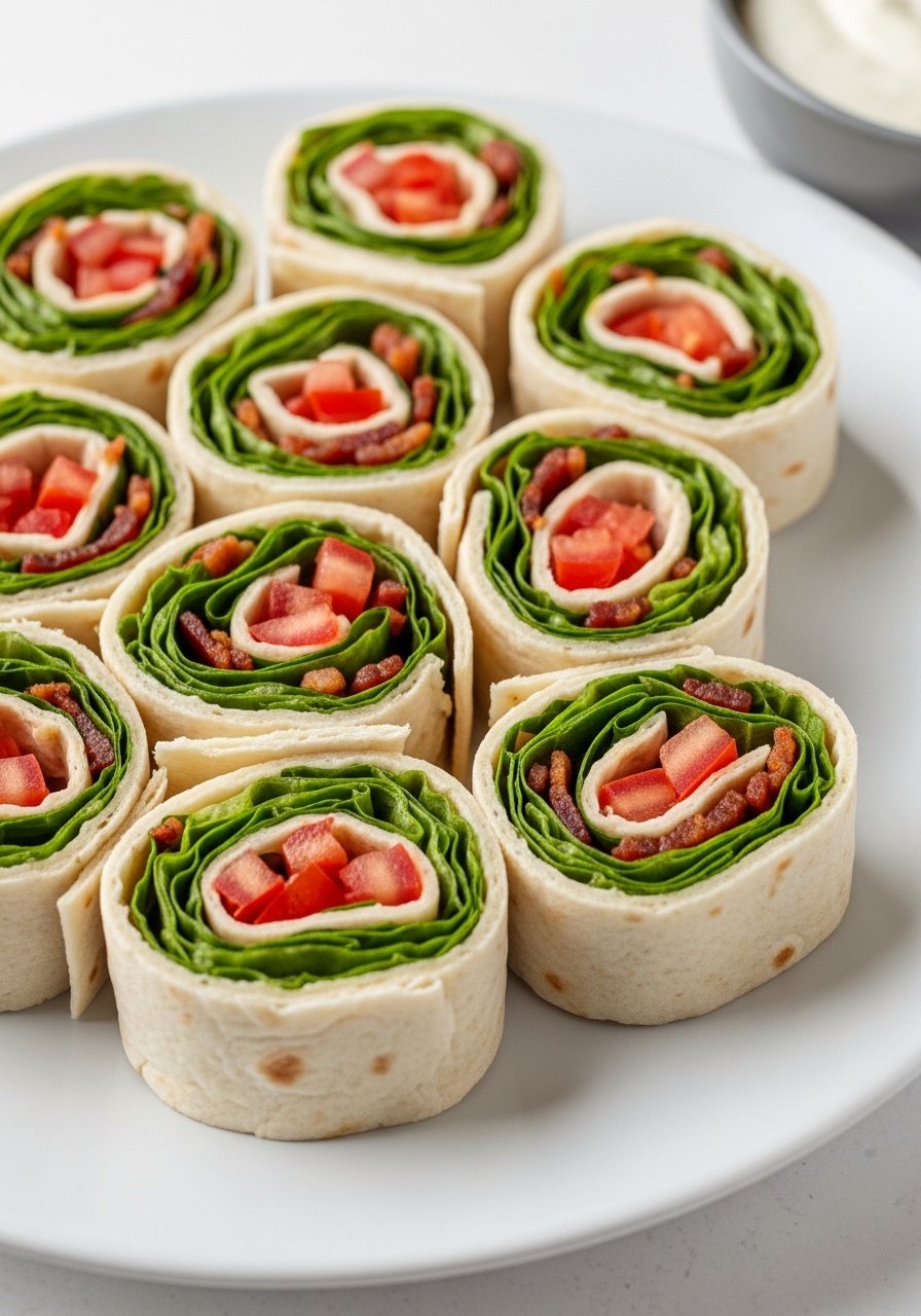 All the BLT flavors in a neat roll-up make crisp lettuce and bacon easy to eat. Use turkey bacon for a lighter option. Chill briefly for cleaner slices.