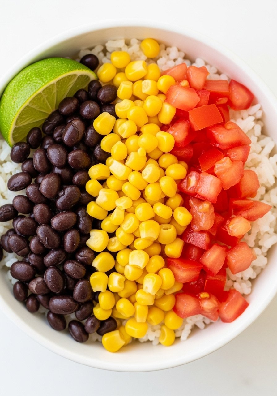 - Layer: Place rice in a container, top with beans, corn, and tomatoes.