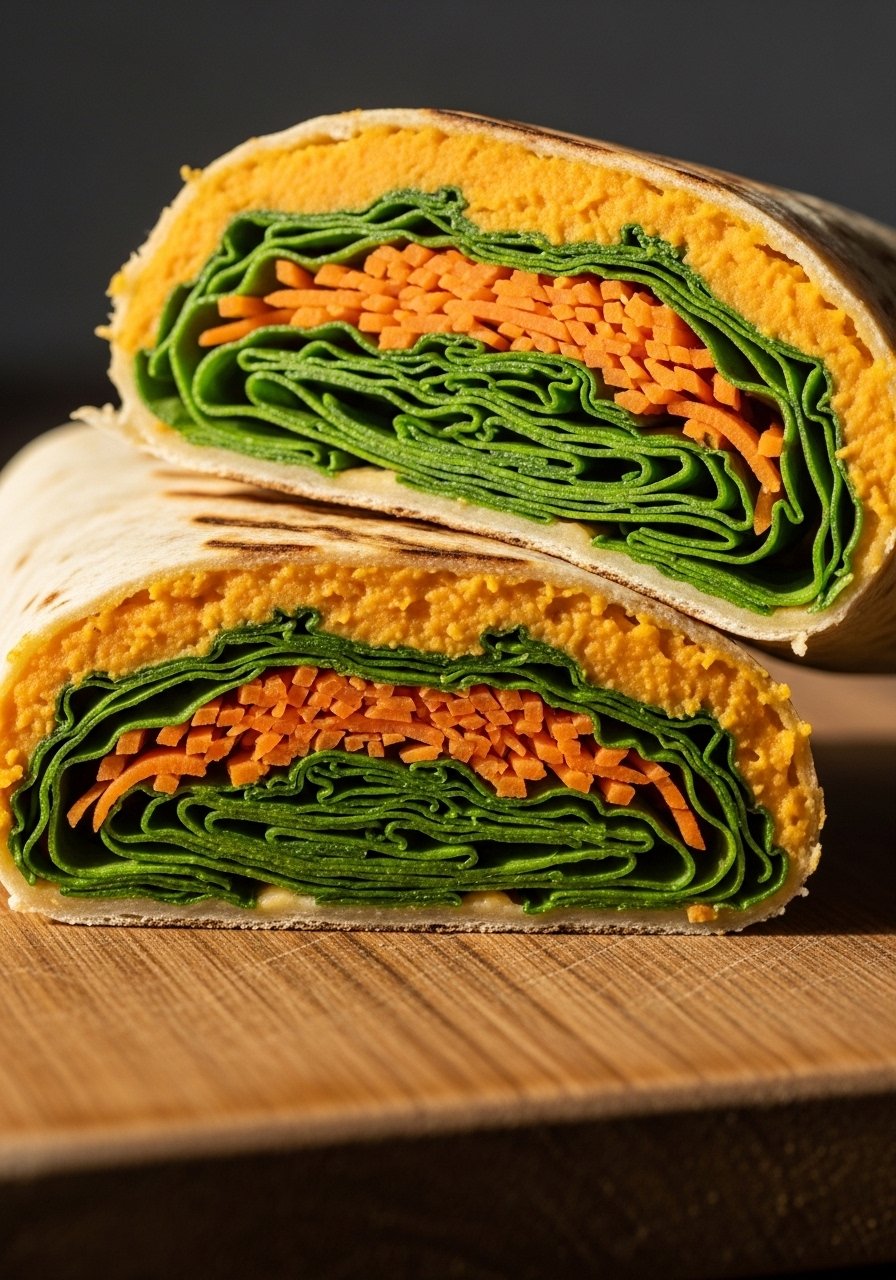 Smooth sweet potato hummus adds sweet flavor and vibrant color to wraps. Combined with greens and carrot, it’s creamy and nutritious. Use whole-grain wrap for extra fiber.
