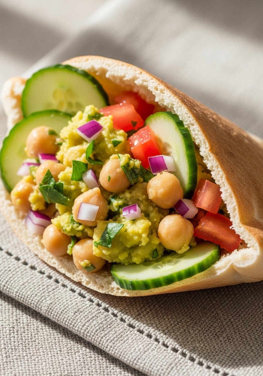 Mashed chickpeas with a lemon-mayo dressing create a chunky, satisfying filling. Stuff into pita pockets for a handheld, protein-rich lunch that’s mild and tangy.