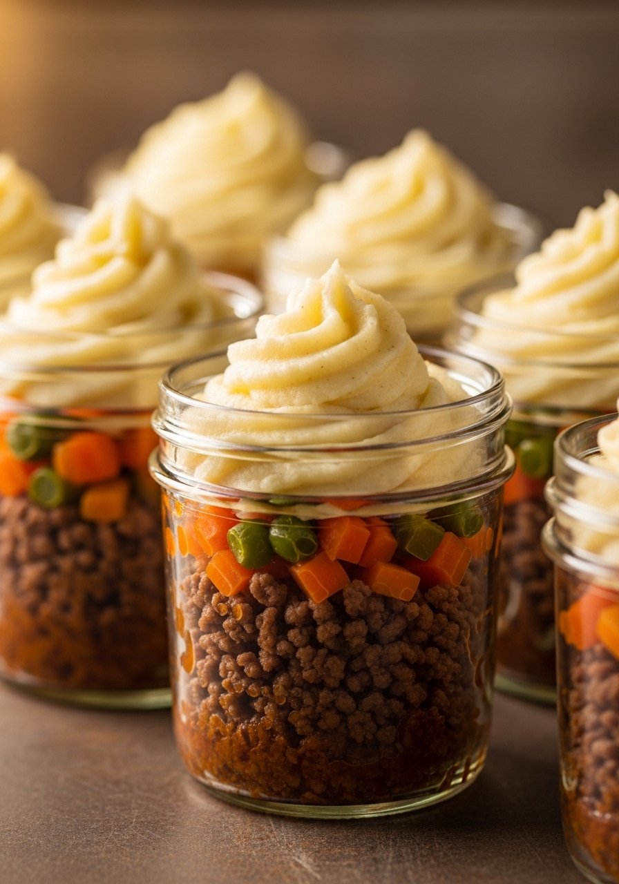 Mini shepherd’s pie in jars feels homey and is portion-controlled. Warm or room temperature, each jar has savory meat, veggies, and a creamy mashed potato lid.