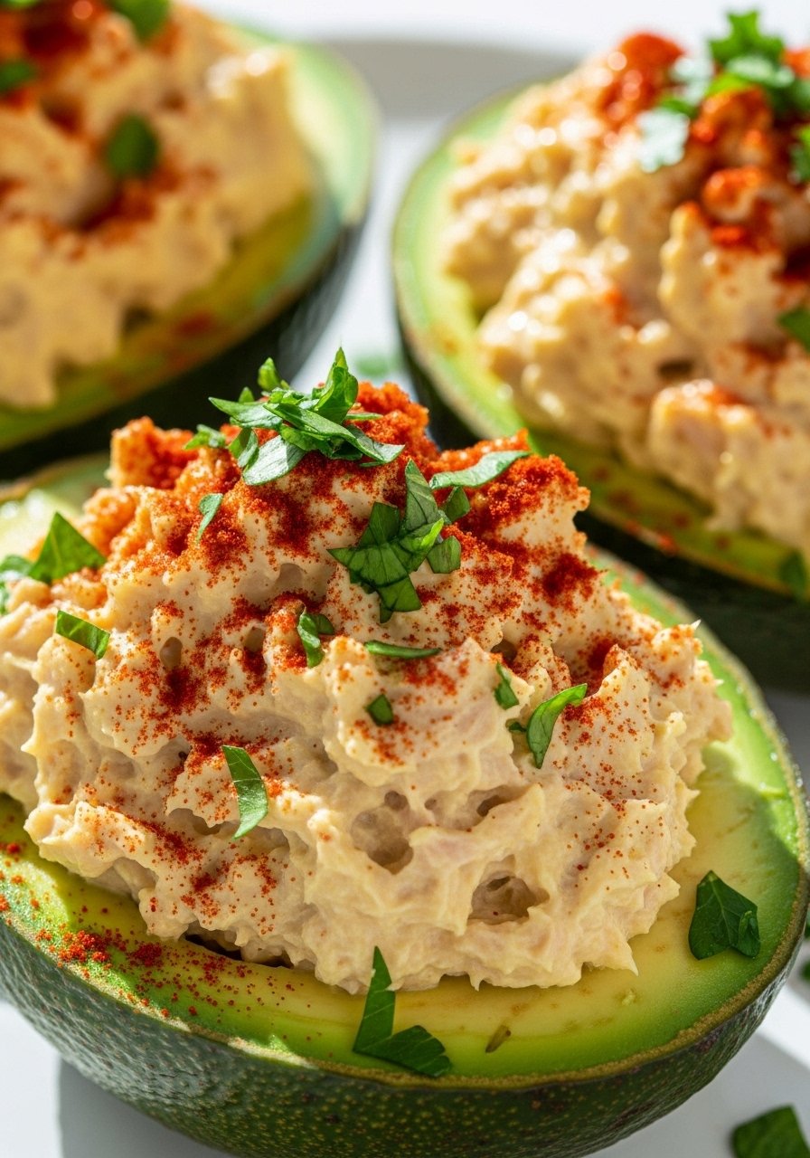 Creamy avocado halves filled with tuna salad are rich and filling. They’re soft, easy to eat with a fork, and packed with healthy fats and protein. Scoop tuna into avocados just before serving.
