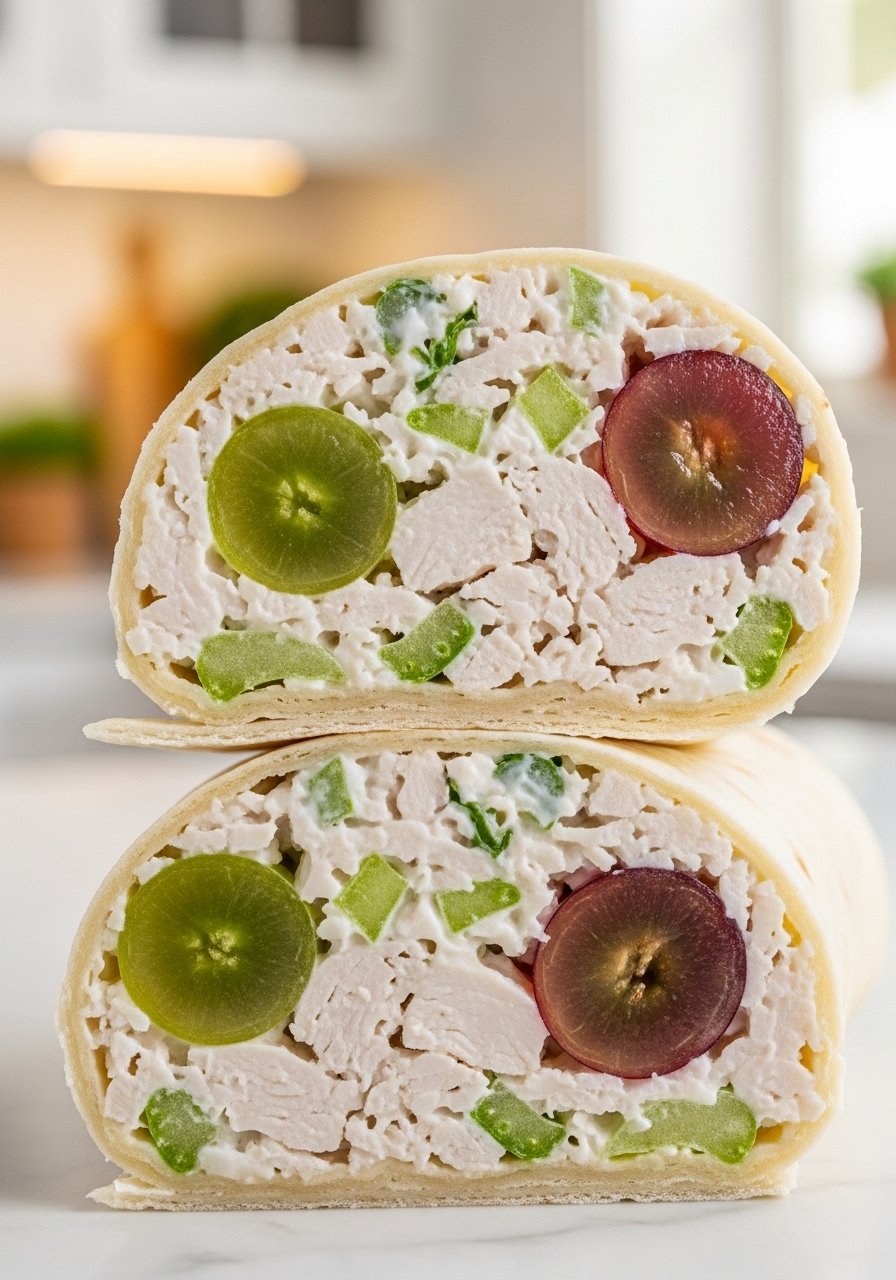 Tender chicken tossed with a little mayo and apple gives sweet crunch. The wrap is portable, cool, and easy for small hands to grip. Use rotisserie chicken for speed.
