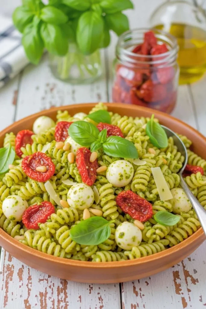 Garnish with fresh basil leaves. This pasta salad is vibrant, fresh, and perfect for lunch or as a side dish.