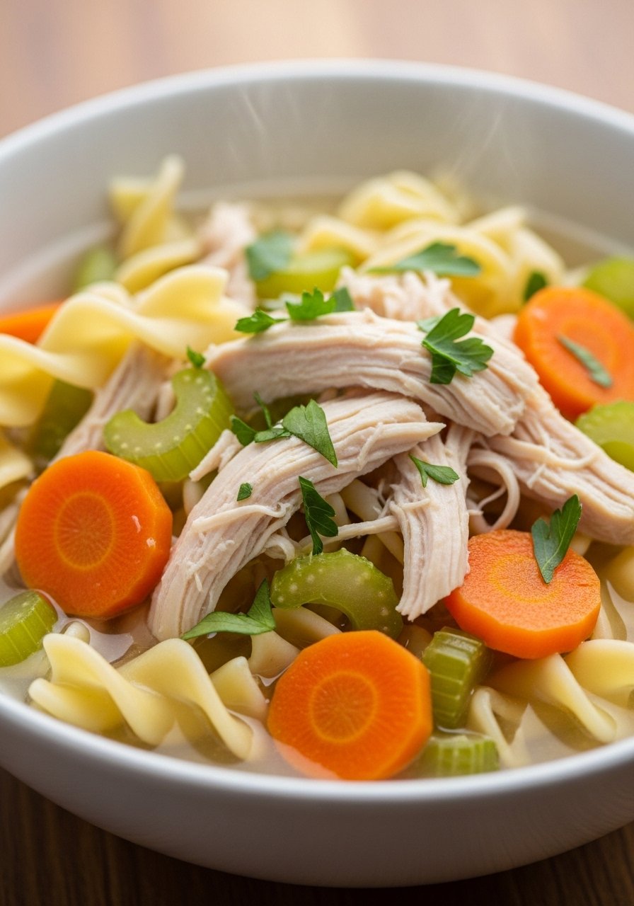 A mild, savory broth with tender chicken and soft noodles. It’s hydrating, comforting, and easy to digest with familiar flavors that calm the stomach and warm you up.