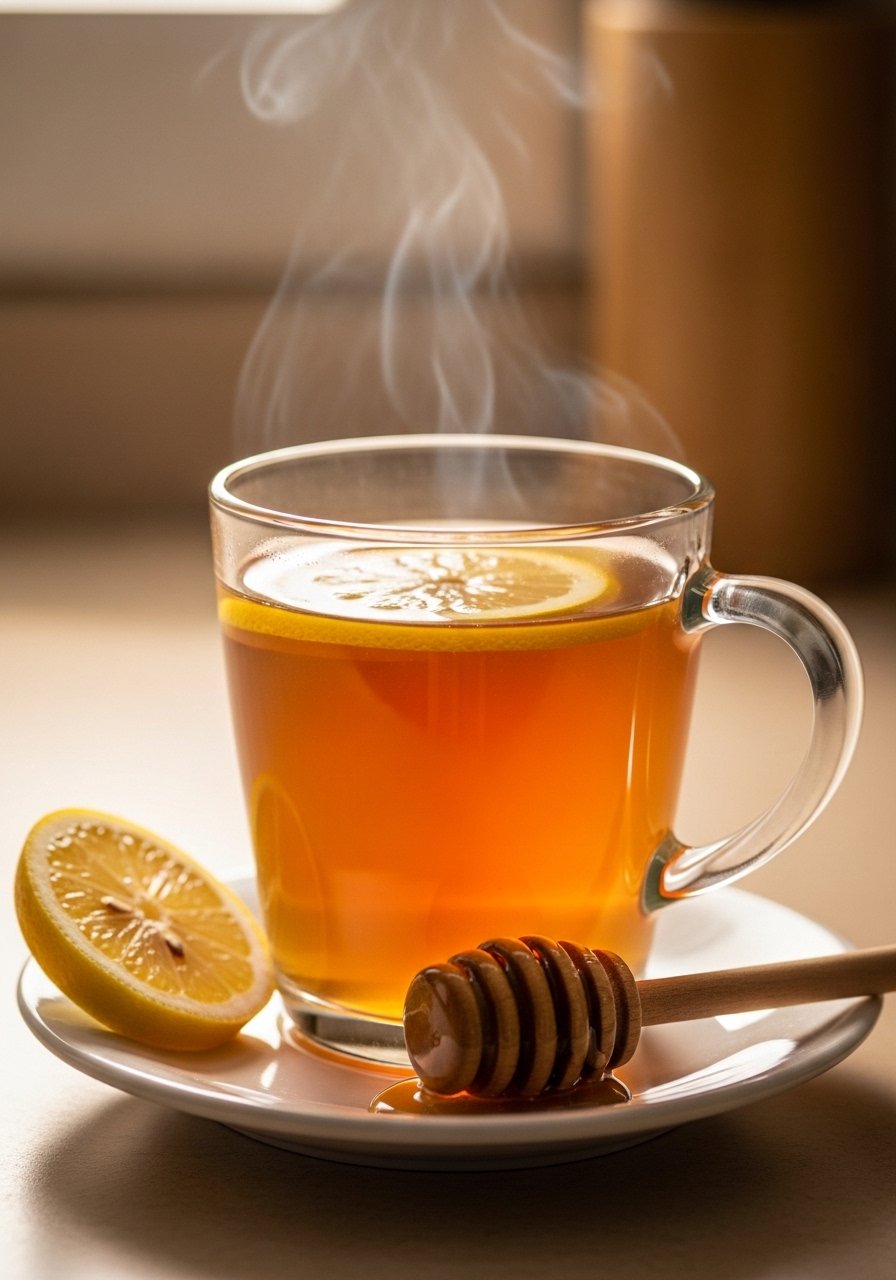 Bright, soothing tea with gentle heat from ginger, vitamin C from lemon, and a touch of honey to calm a sore throat. Sip slowly for hydration and relief.