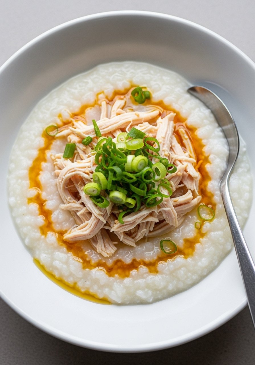 A silky rice porridge that’s easy to swallow. Plain but nourishing, with tender chicken and a hint of sesame oil if you want flavor without overwhelming the stomach.