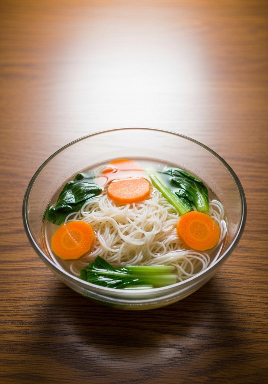 A light, hydrating broth with tender vegetables and delicate noodles. It’s easy to digest and full of mild, nourishing flavors.