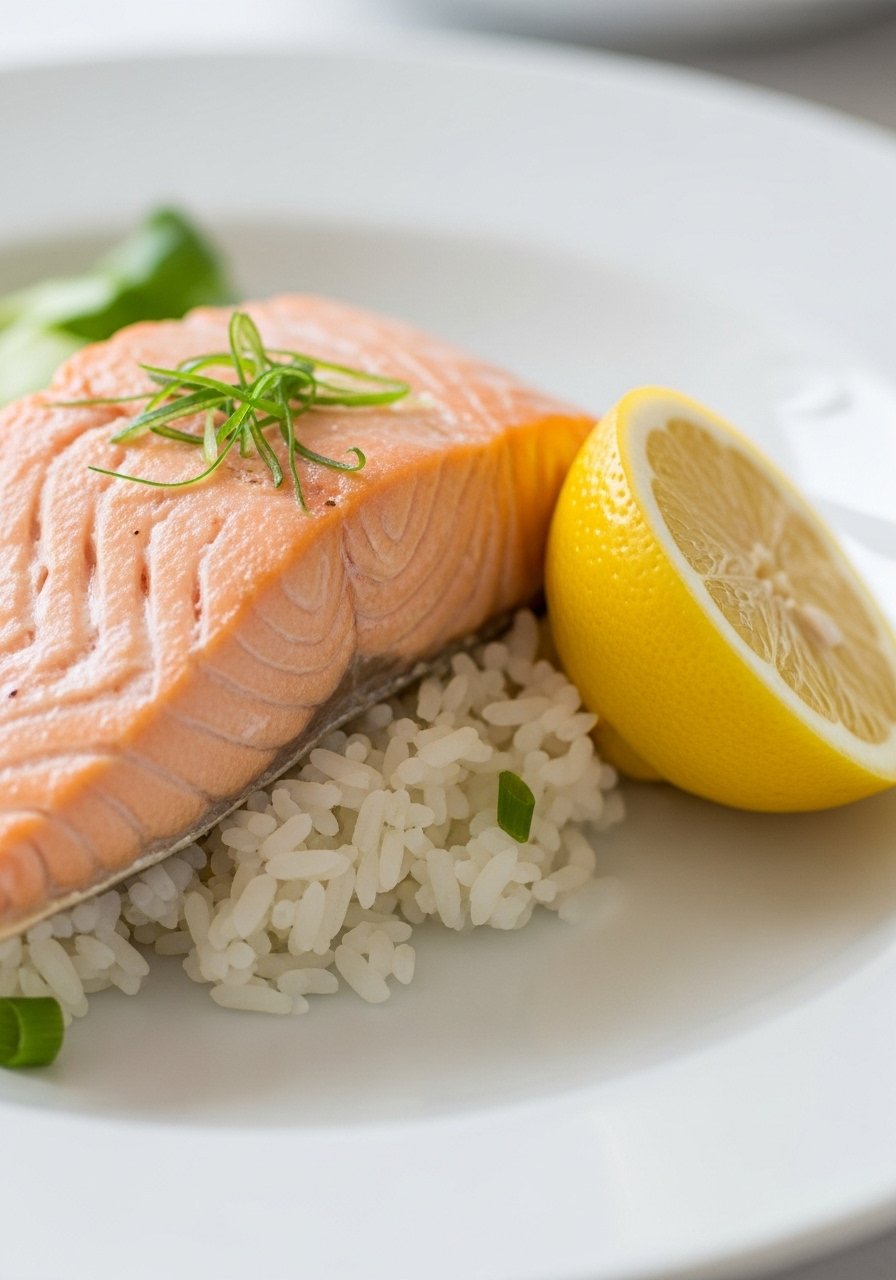 - Finish and serve: Drizzle salmon with lemon juice, season lightly, and serve over rice.