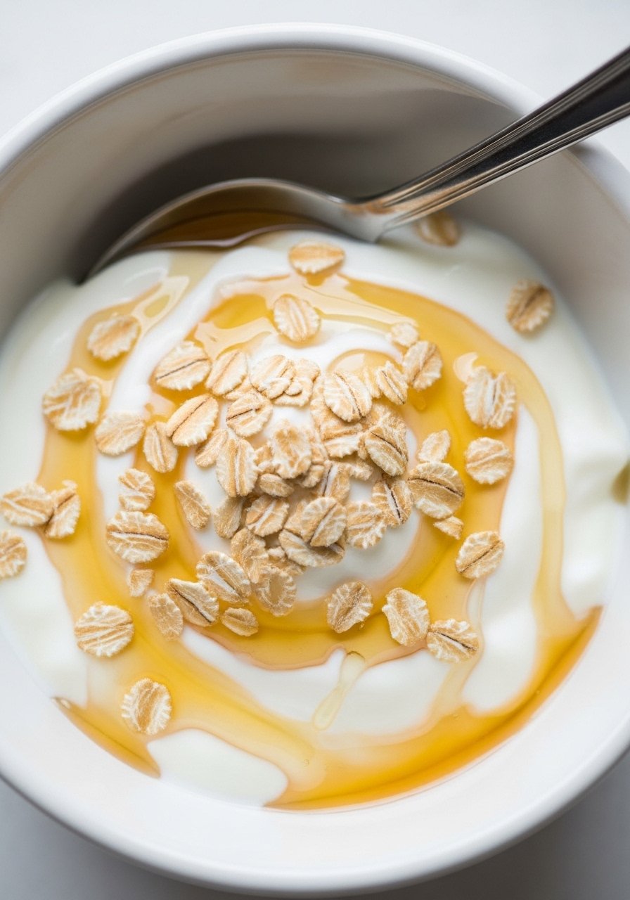 Probiotic-rich yogurt with a touch of honey and soft toasted oats provides mild protein and easy texture, ideal when you want a light but satisfying bite.
