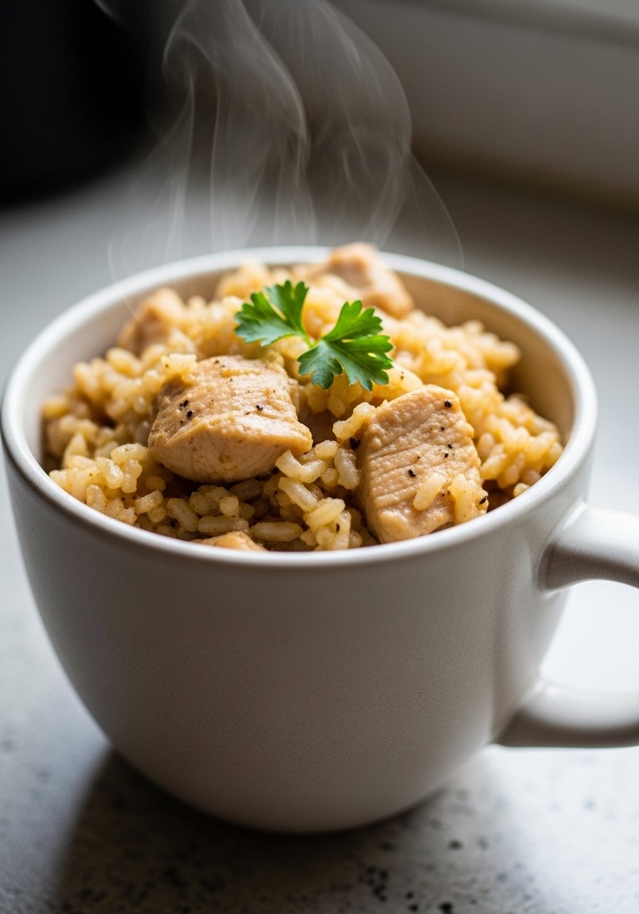 A quick, small-portion meal you make in a mug or small pot. Soft rice and tender chicken cook together for an easy recovery meal.