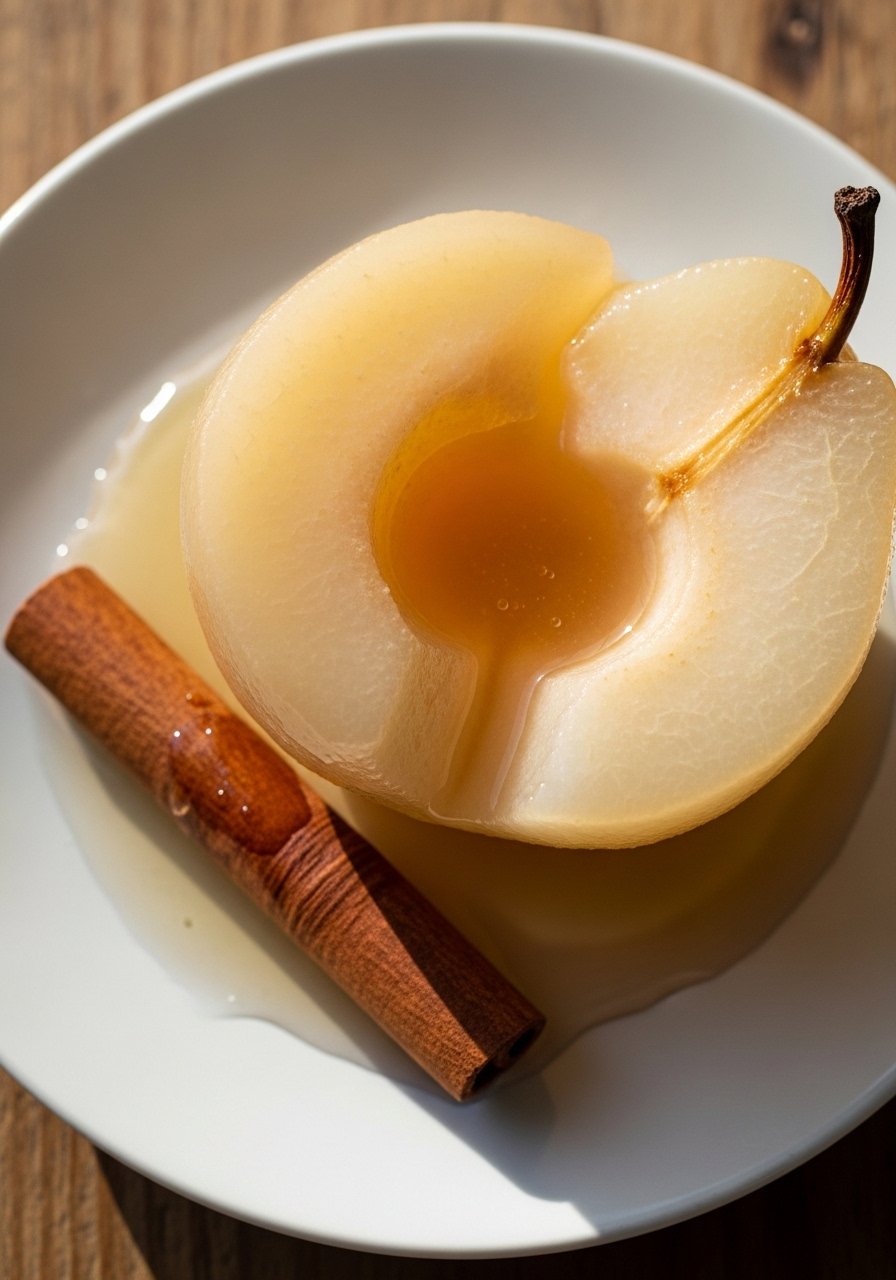 Soft, lightly sweet poached pears are easy to chew and digest. Mildly spiced with cinnamon, they make a soothing dessert or snack.