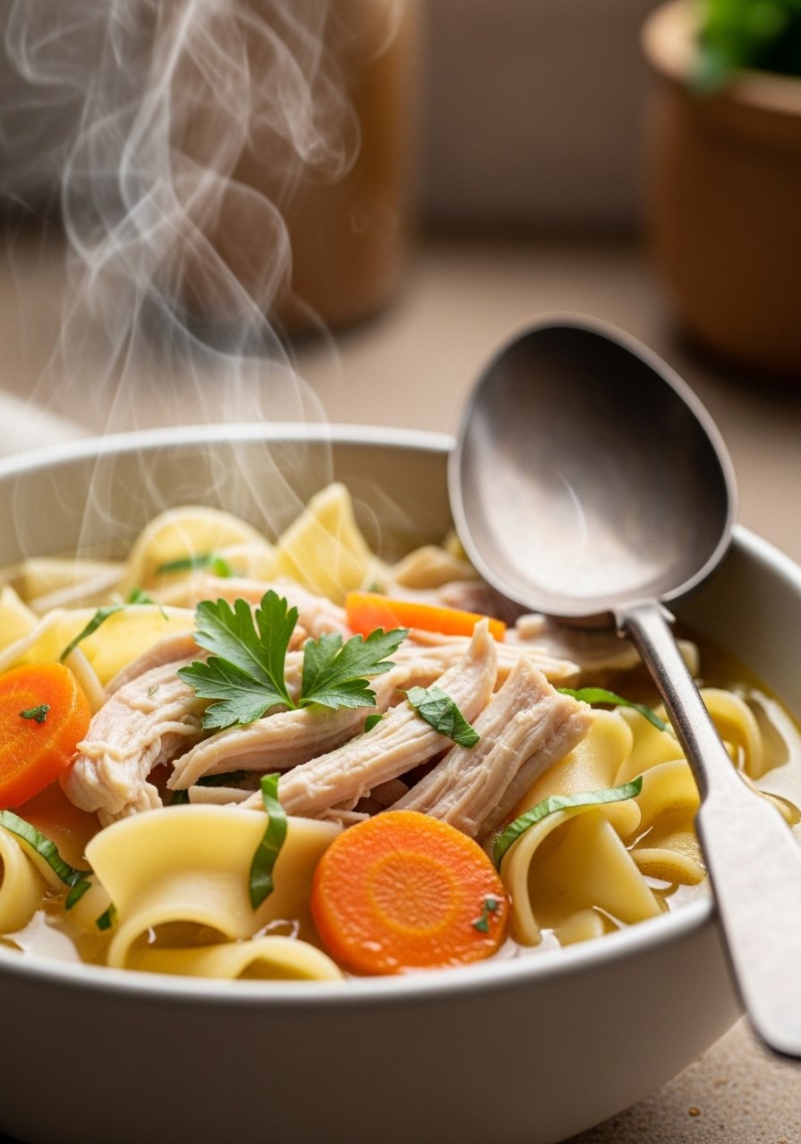 Warm, familiar, and easy to digest. Tender chicken and soft noodles make this soup filling without being heavy. It’s classic comfort when you need a simple meal.