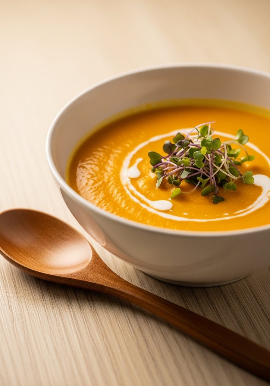 A silky soup with gentle sweetness, ginger, and garlic for flavor and comfort. It’s easy to digest and soothing when warm.