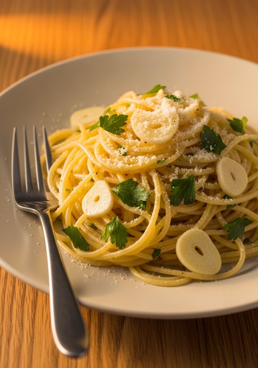- Toss pasta: Drain pasta, reserve a little cooking water, add pasta to the pan, toss with garlic oil and parsley; add a splash of water if needed.