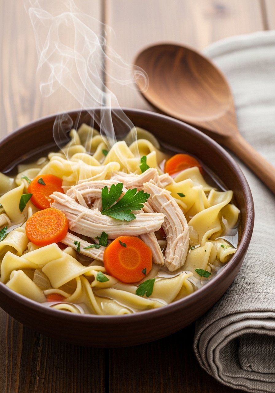 A timeless, soothing soup with tender chicken, soft noodles, and a clear savory broth. It hydrates, comforts, and is easy to digest—perfect when you need something gentle but nourishing.