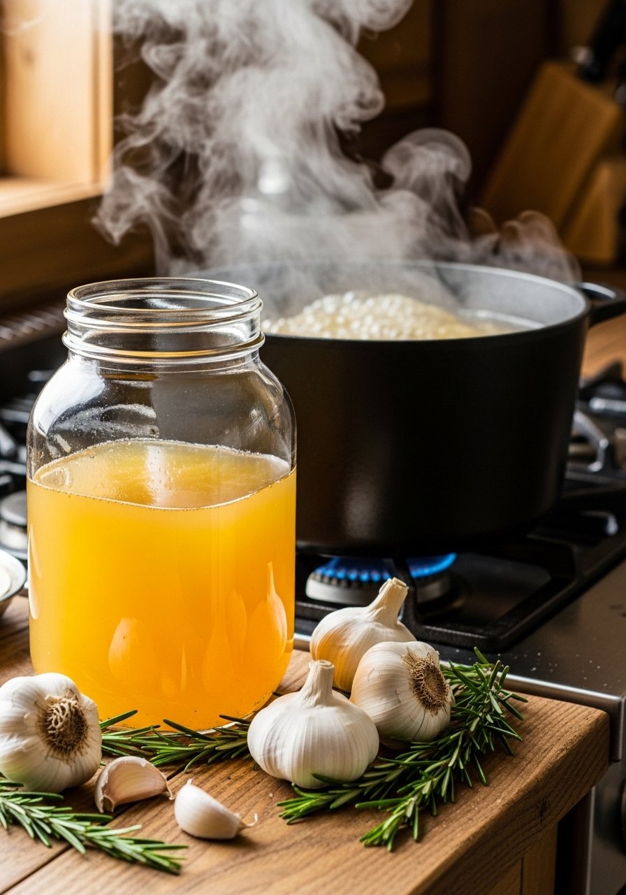 - Simmer the broth: Transfer to a large pot, add vegetables, vinegar, herbs, and water. Bring to a boil, then reduce to low and simmer 6–12 hours (longer for more richness).