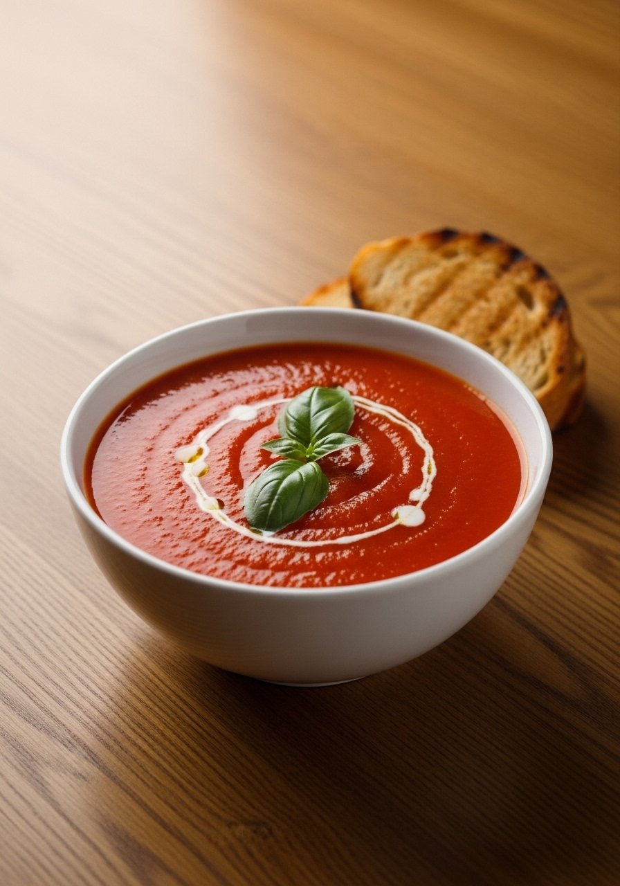 A silky, aromatic soup with bright tomato flavor and fresh basil. Comforting and gentle, perfect with toast for a simple but satisfying meal.
