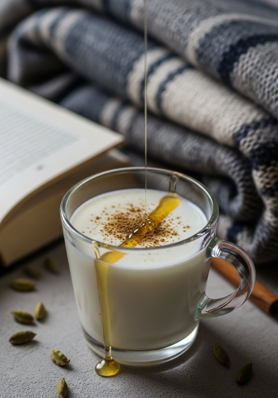A soothing bedtime drink with gentle spices. Warm milk calms and helps rest, while honey soothes the throat.