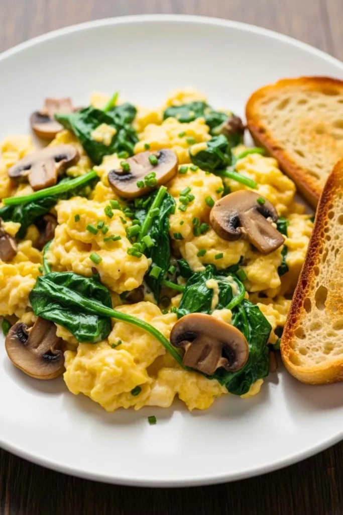 These scrambled eggs are rich, savory, and full of vegetables. The mushrooms add depth, while the spinach brings freshness. A touch of cream or milk creates a silky finish that makes this dish feel luxurious yet simple enough for a weeknight dinner.