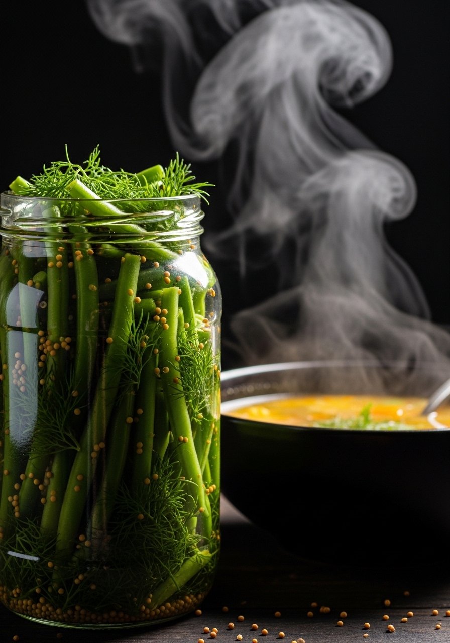Crunchy, savory beans with dill and mustard. These develop a mild tang and keep their snap when fermented correctly.