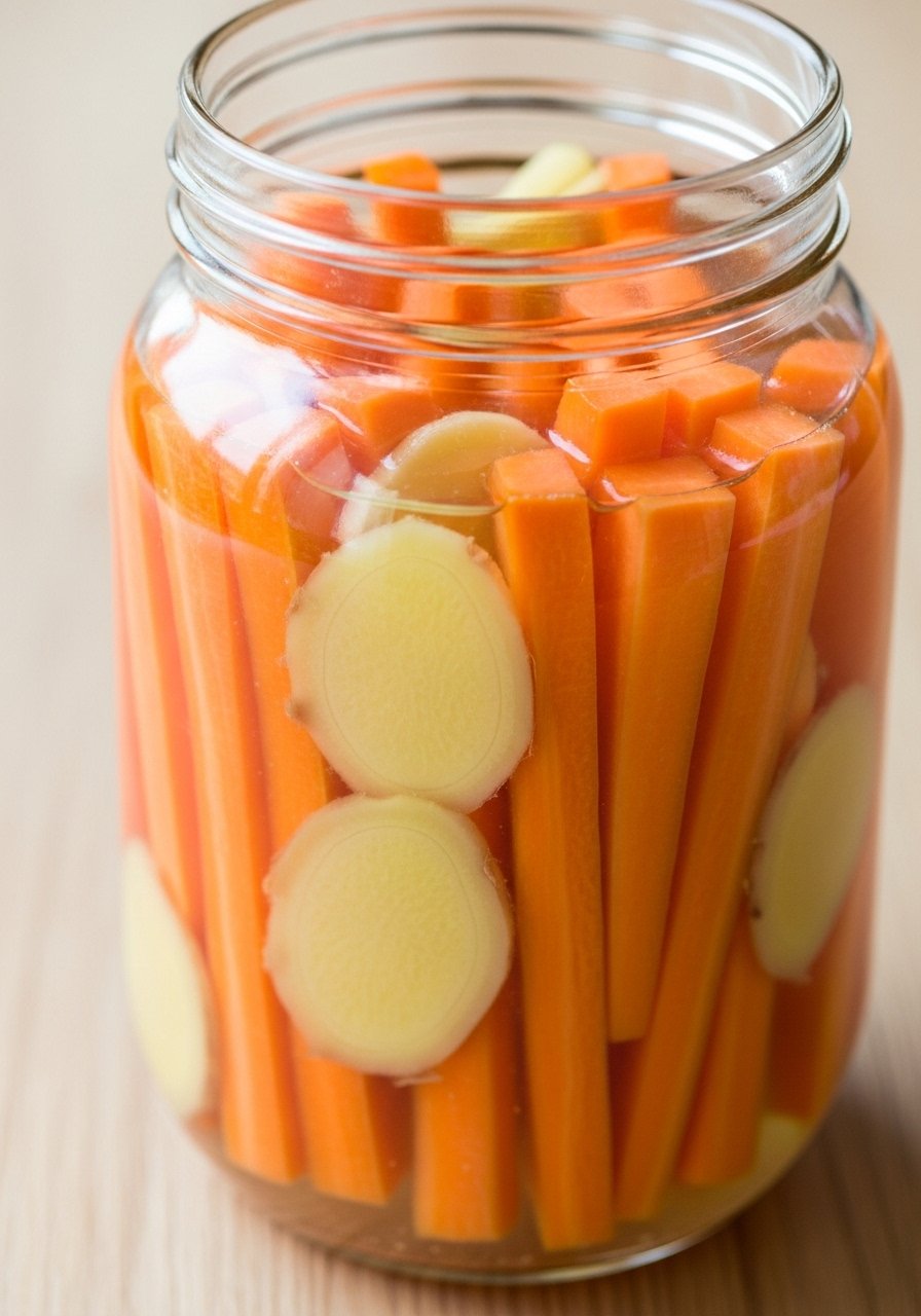 - Pack Carrots — Layer ginger: Pack carrot sticks and ginger tightly in a jar.