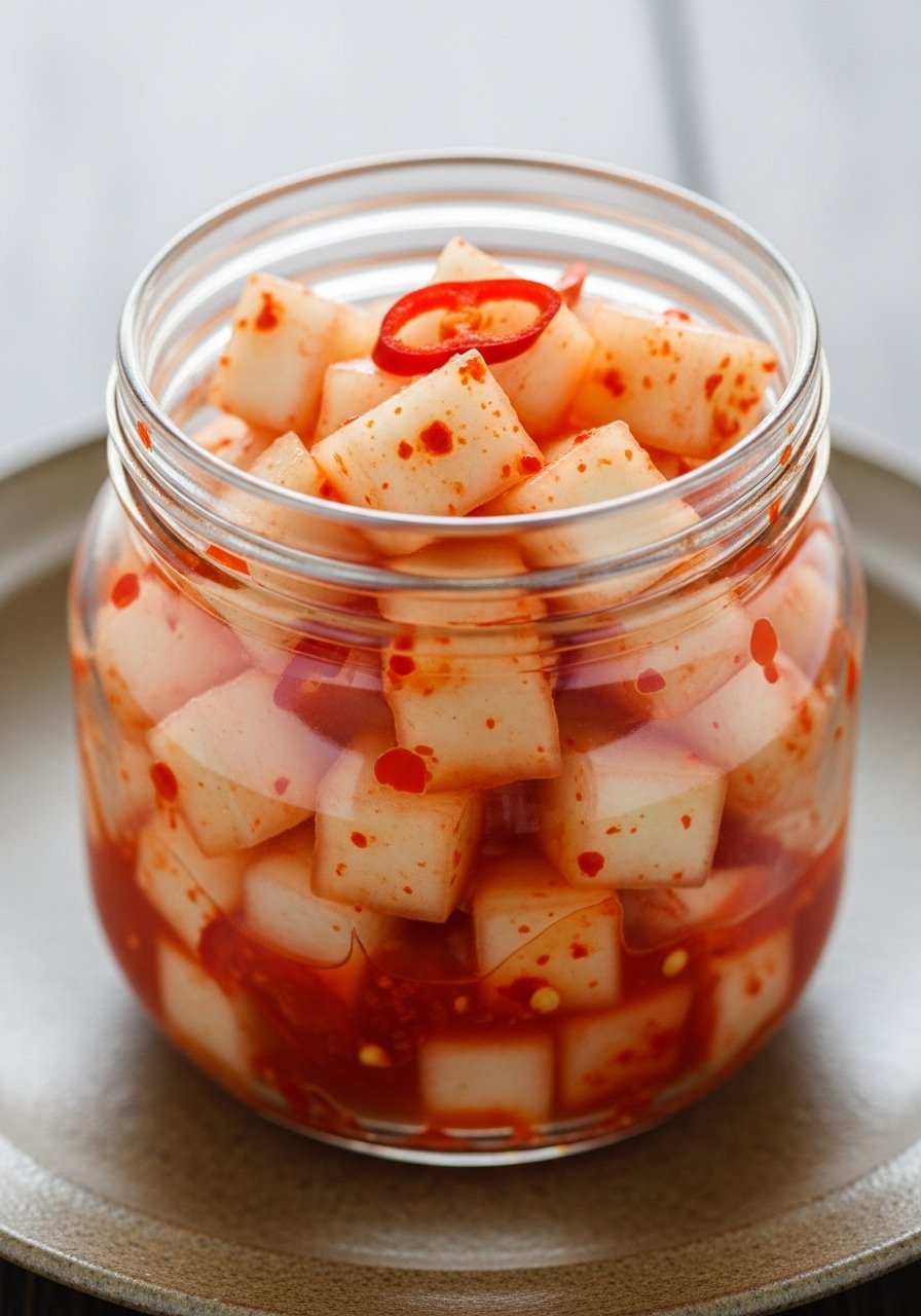 A crunchy, spicy radish kimchi with a satisfying crunch and bold chili flavor. Great with savory meals or rice bowls.