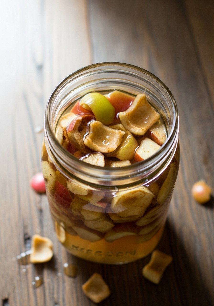 - Fill Jar — Add scraps: Place apple scraps in a jar and cover with sugar water.